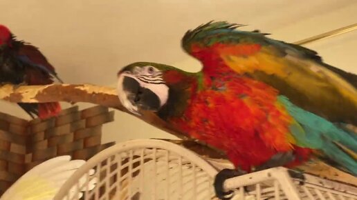 Енот любит проводить время с попугаями.