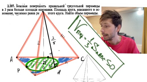 №2.107. Боковая поверхность правильной треугольной пирамиды в 3 раза больше площади основания. Площадь круга, вписанного в вна радиусу