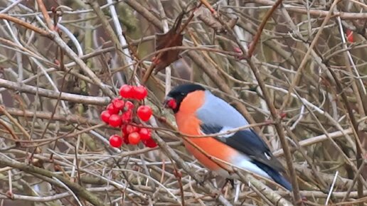 Как снегири едят калину, ягода понравилась птичкам