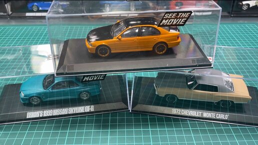 Модели из Форсажа BMW 540i E39 2001, NISSAN Skyline R34 GT-R 1999, CHEVROLET Monte Carlo 1970 в масштабе 1/43.