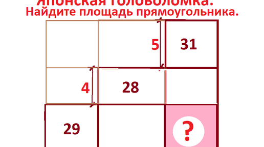Японская головоломка. Найти площадь прямоугольника по другим площадям 28; 29 и 31