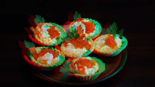 3D stereo red-cyan Тарталетки с креветками и красной икрой