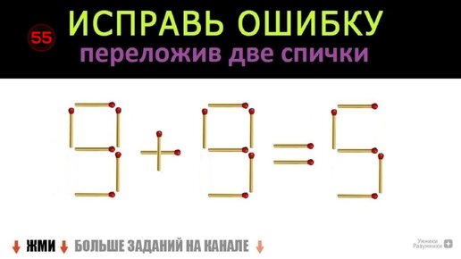Математическая головоломка со спичками 🥢 9+9=5 😎 Исправь ошибку переложив две спички 🙄 Получи верное равенство