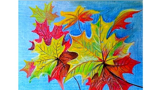 🍁🩵🍁Кленовые листья на голубом. Рисунок сухой пастелью и карандашами на тонированной бумаге.