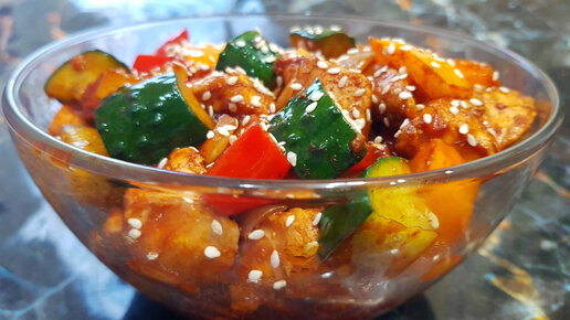 Потрясающе вкусный салат! Салат на каждый день. Теплый салат с курицей и овощами.