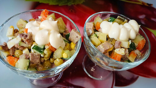 Салат "Осенний сад". Аппетитный салатик по мотивам "Оливье". На вкус нежный и сбалансированный. Украсит праздничный стол.