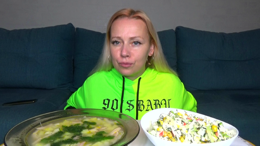 Мукбанг салат с крабовыми палочками и листьями салата, супчик куриный , легкий.Еда.