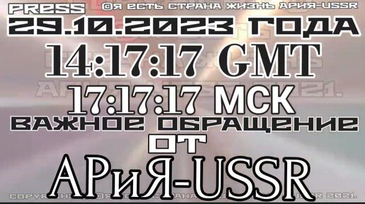 Прямой эфир 29.10.2023 14:17:17 GMT 17:17:17 МСК ВАЖНОЕ ОБРАЩЕНИЕ ОТ АРиЯ-USSR
