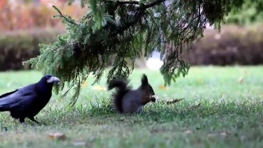 Два таких разных обитателя Белоусовского парка. Пока белочка ест, ворона что-то ищет...