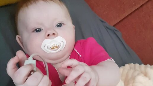София играет перед сном. 6 месяцев. Лучше игрушки не нашлось. Потянуло к проводам и розеткам.