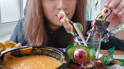 Мукбанг хэллоуин тыквенный суп, блины с тыквой и индейкой, жевательные приколюхи