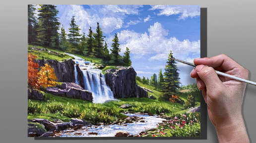 Как нарисовать пейзаж с водопадом и ручьём. Живопись акрилом от Корреа Арт