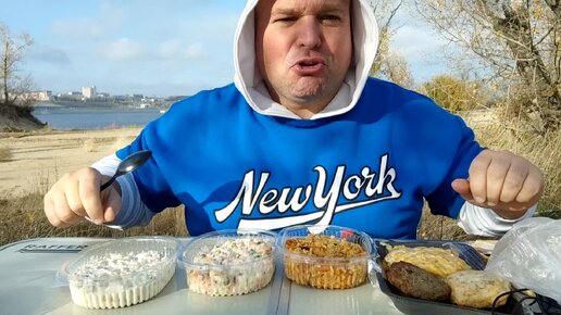 МУКБАНГ в ноябре на берегу Волги/ОБЖОР три салата, плов с курицей и мясо по французски