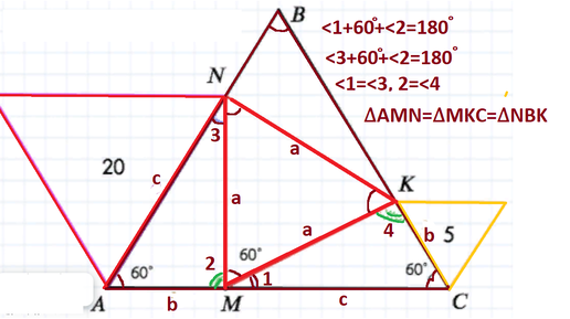 Найти площадь равностороннего треугольника, вписанного в другой треугольник, если заданы площади 20 и 5