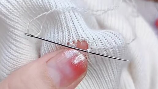 Иголкой для ручного шитья и крючком можно починить дырку в свитере с тремя оборванными нитками.
