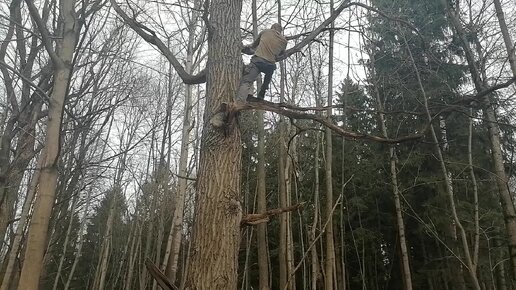 Повешение скворечника Егором в Битцевском лесу на дуб. Рискует жизнью парнишка