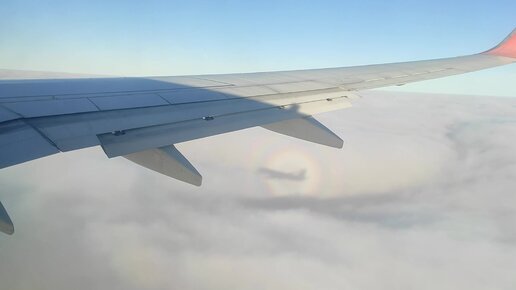 Эффект Глория на облаках и работа закрылков при заходе на посадку в Шереметьево