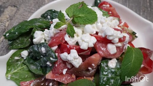 Полезный салат со свежими овощами в сливках, с зернистым творогом с мятой и шпинатом.