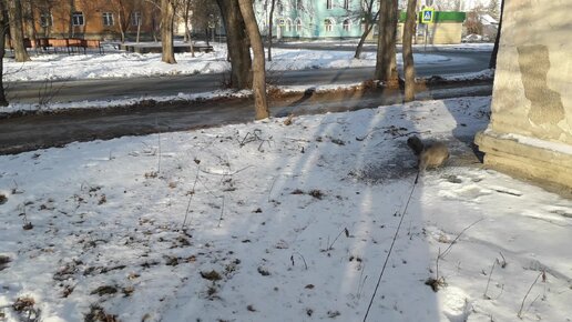 Собака с хозяином гуляет в сквере.