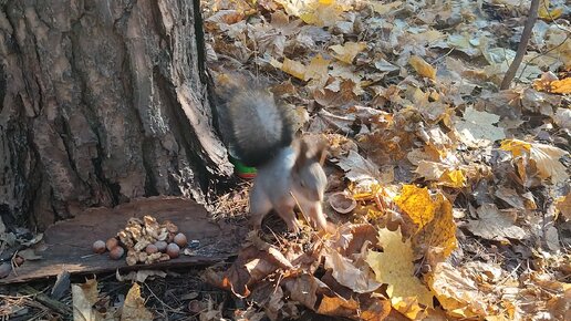 Белка маскирует спрятанные орехи листьями