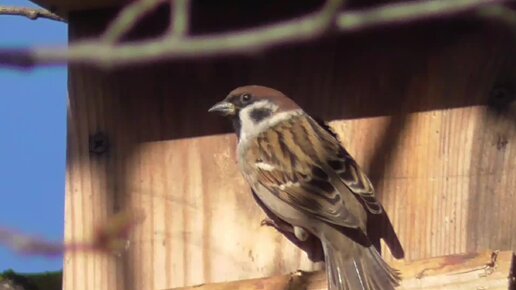 ВОРОБЬИ осматривают скворечник перед наступлением зимы