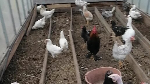 Молодые куры, утки и индюшата, им по 4 месяца, живут во второй теплице. Приезжаю их кормить, поить через день.