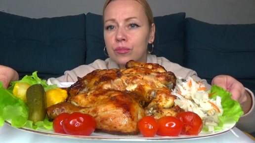 Мукбанг Курица красавица запеченная в духовке, маринованная капуста с селедкой, соленые патиссоны, огурцы и черри помидорки. Еда.