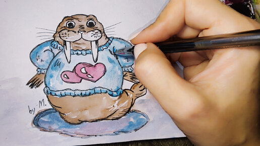 Как нарисовать моржа в куртке, его складки, клыки карандашом. Милый кавайный морж за пару минут акварелью