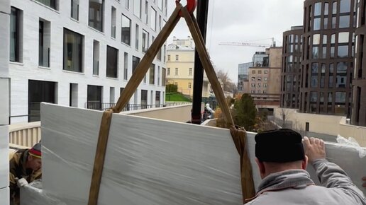 Разгрузка на 3-й этаж четырёх столешниц и стеновой панели общим весом около 700кг и размером 3 на 1.5 метра