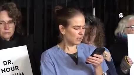 В Великобритании протестующая женщина-врач, читает экстренное сообщение от главы больницы Шафа в Газе перед кабинетом премьер-министра