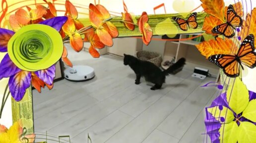 Первый запуск робота-пылесоса и реакция кошек. Черная кошка Стеша дерется с пылесосом