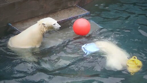 Медвежата прыгая в воду и плавая, играют желтым поплавком, канистрой и красным шаром одновременно.