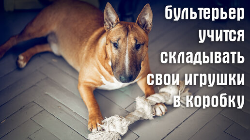 Мини бультерьер собирает свои игрушки в коробку. Минибуль Данчик.