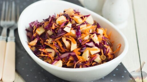 Витаминное блюдо на скорую руку. Салат из краснокочанной капусты с яблоком и изюмом