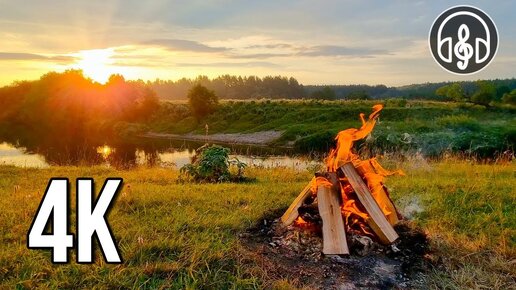 Красивый рассвет у реки со звуками костра и пением утренних птиц.