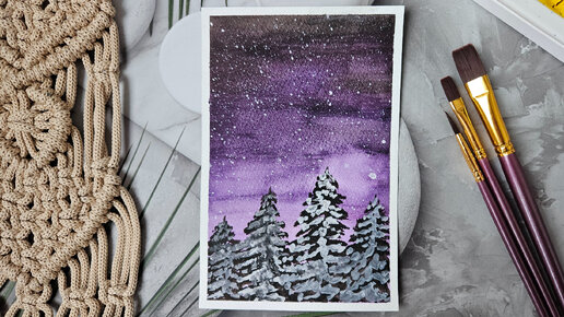 Как нарисовать зимнюю открытку / рисуем зимний лес ночью
