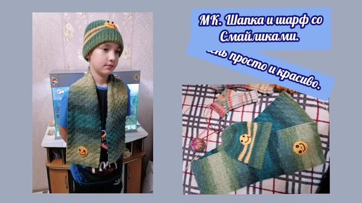 МК. Шапка и шарф спицами для мальчика 9 лет тёплые с аппликацией вязаной крючком "Смайлики" . Просто, красиво, модно.