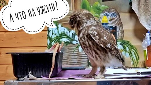 Сыч Лучик хозяйничает на столе и намекает, что одной маленькой мышки на ужин ему маловато