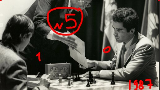 Анатолий Карпов - Гарри Каспаров: победа Анатолия Евгеньевича белыми в защите Грюнфельда. Партия №5 матча 1987 года в Севилье, 1-0