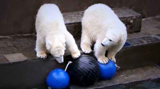 Медвежата Белка и Стрелка купаются и играют с синими шарами, пытаясь вытащить их из воды.
