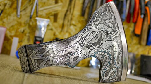 Топор с осьминогом. 2 месяца работы. Рисунок на металле. Простая технология из ржавого топора