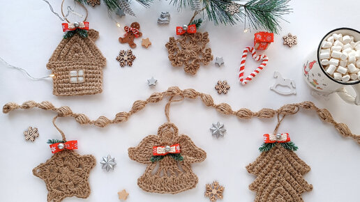 Бусы на ёлку из джута крючком. Вязаные новогодние украшения. Ёлочные игрушки своими руками. Новогодняя гирлянда. Рождественский декор.
