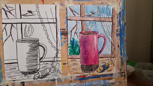 Графическая работа чёрным маркером и акварелью "Чашка чая"
