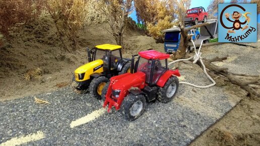 Автовоз застрял, два трактора убирают упавшее дерево - Машинки Игрушки. Манкиту