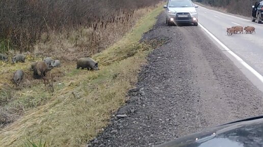 Стадо кабанов с поросятами, на дорогах Ярославской области.