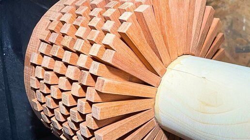 Напилил брусочки, наклеил по кругу цилиндра и обработал до чаши. Лак творит чудеса.