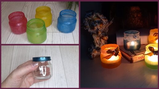 Взяла баночки из-под детского питания и сделала яркие подсвечники