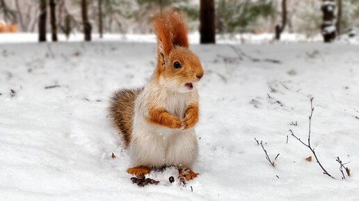 Кто так кору с дерева сдирает? Уже думала, что никого не встречу. Но нет, прискакали две белочки.