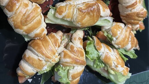 Круассаны с начинкой . Слоеное тесто, сыр творожный , листь салата, огурец, форель и авокадо