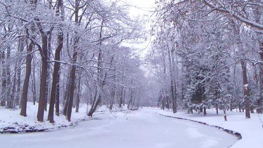 В красивом парке идет снег